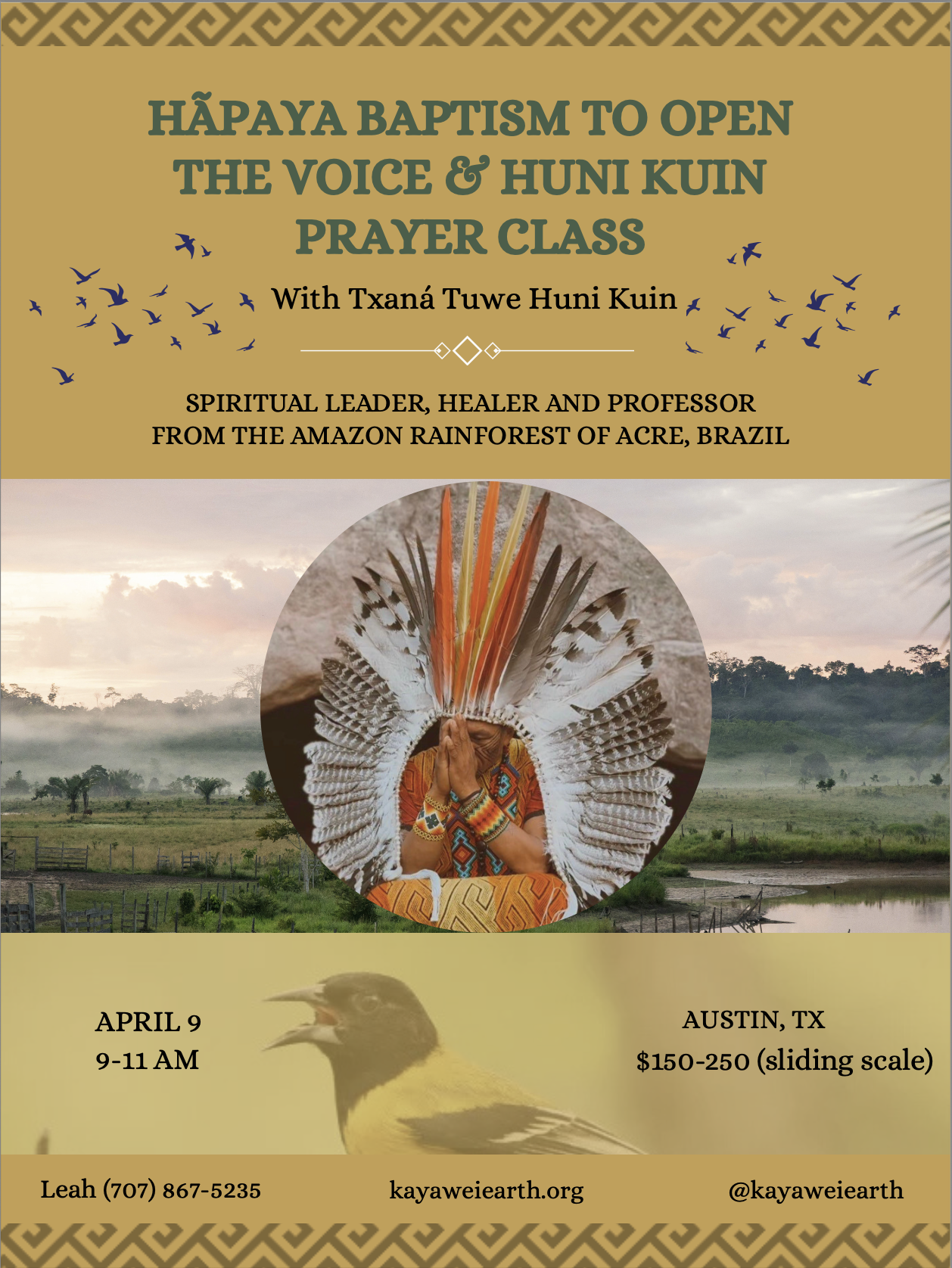 April 8, 7:00-9:30pmHapaya is a traditioanl baptism used to open one’s voice, improve memory and learn new skills. Through a hot pepper infusion on the tongue and prayer, the spirit of the Txana bird is placed inside one’s body, followed by a 3 day diet.